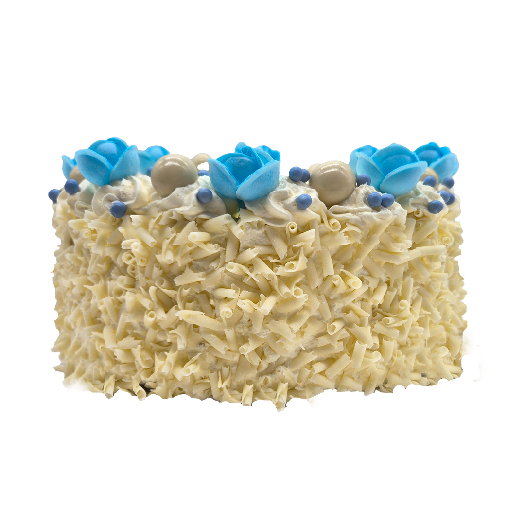 Introducing Buckley’s Fresh Blue Flowers & Pearls Cake, offering your choice of vanilla or chocolate sponge base. Personalize it with either cream or buttercream fillings, available in a variety of square or round sizes.