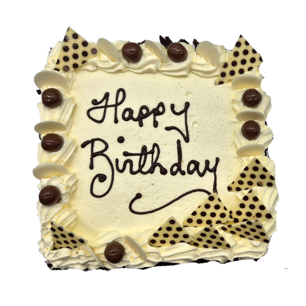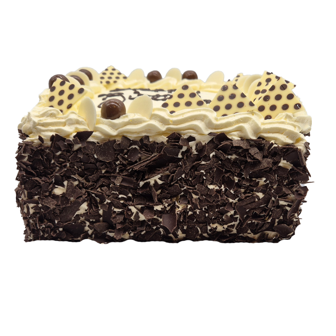 Introducing Buckley’s Fresh Chocolate Triangles, Buttons, and Maltesers Cake, featuring your choice of vanilla or chocolate sponge base. Personalise it with either cream or buttercream fillings. Available in various square or round sizes, this decadent creation is adorned with chocolate flakes along the sides and crowned with a delightful assortment of Maltesers, buttons, and spotted chocolate triangles on top.